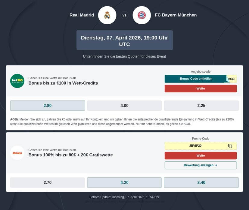Wir analysieren die Form der Mannschaften und stellen unsere Top-Wetten vor, wenn Sie auf Real Bayern tippen. Außerdem bietet die aktuelle Real Madrid gegen Bayern München Tipphilfe unsere Buchmacher-Empfehlungen und alle Übertragungspartner für Hin- und Rückspiel.