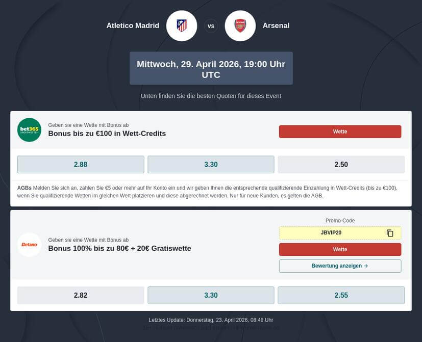 Deutlicher sind die Wettquoten für den Einzug in das Finale der Champions League. Hier nimmt Arsenal London mit 1.37 klar die Favoritenrolle ein. Das spanische Team gilt mit einer Atlético Wettquote von 2.75 über Hin- und Rückspiel hingegen als Außenseiter.