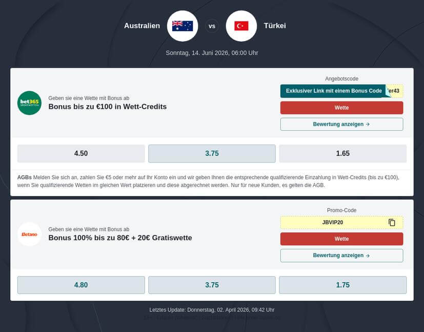 Durch die deutsche Lizenz wird bei Betano und bet365 ein sehr guter Schutz geboten, wenn Sie auf Australien Türkei tippen. Mit dem Promo Code Betano erhalten Sie z. B. eine Gratiswette ohne Anmeldung.
