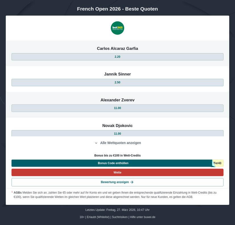 Als Buchmacher für French Open 2026 Wetten sollten Sie die Unternehmen Betano und bet365 überprüfen. Mit starken Quoten und einer großen Auswahl von Wettvarianten können die Wettbüros bei Tennis-Wetten überzeugen. Hinzu kommt eine deutsche Lizenz, sodass Ihre Tipps für French Open 2026 Wettquoten garantiert legal sind.