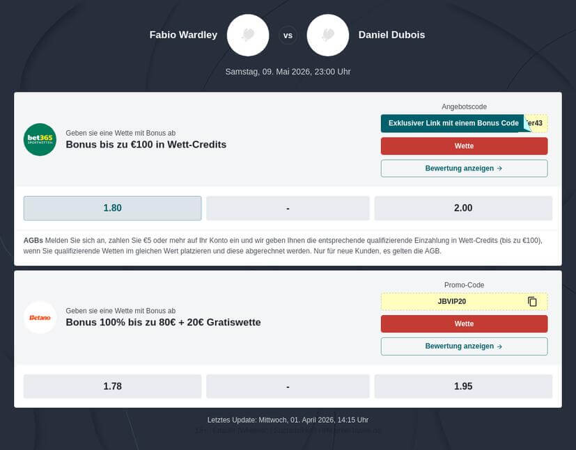 Bei dem Fight Fabio Wardley vs Daniel Dubois werden Sie bei mehreren Buchmachern fündig. Für attraktive Wardley vs Dubois Wettquoten sind die Wettbüros Betano und bet365 einen Blick wert. Die Wettanbieter punkten nicht nur mit starken Quoten für Wardley vs Dubois Wetten, sondern ermöglichen mit dem umfangreichen Betbuilder auch die einfache Zusammenstellung Ihres Tippscheins. Durch die deutsche Lizenz sind legale Wett-Tipps für den Fight garantiert.